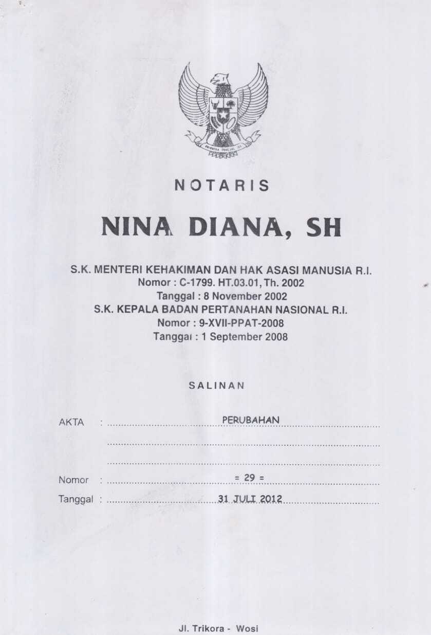 No./ Tgl. Akta Perubahan | : | Nomor 29 Tanggal 31 Juli 2012 |